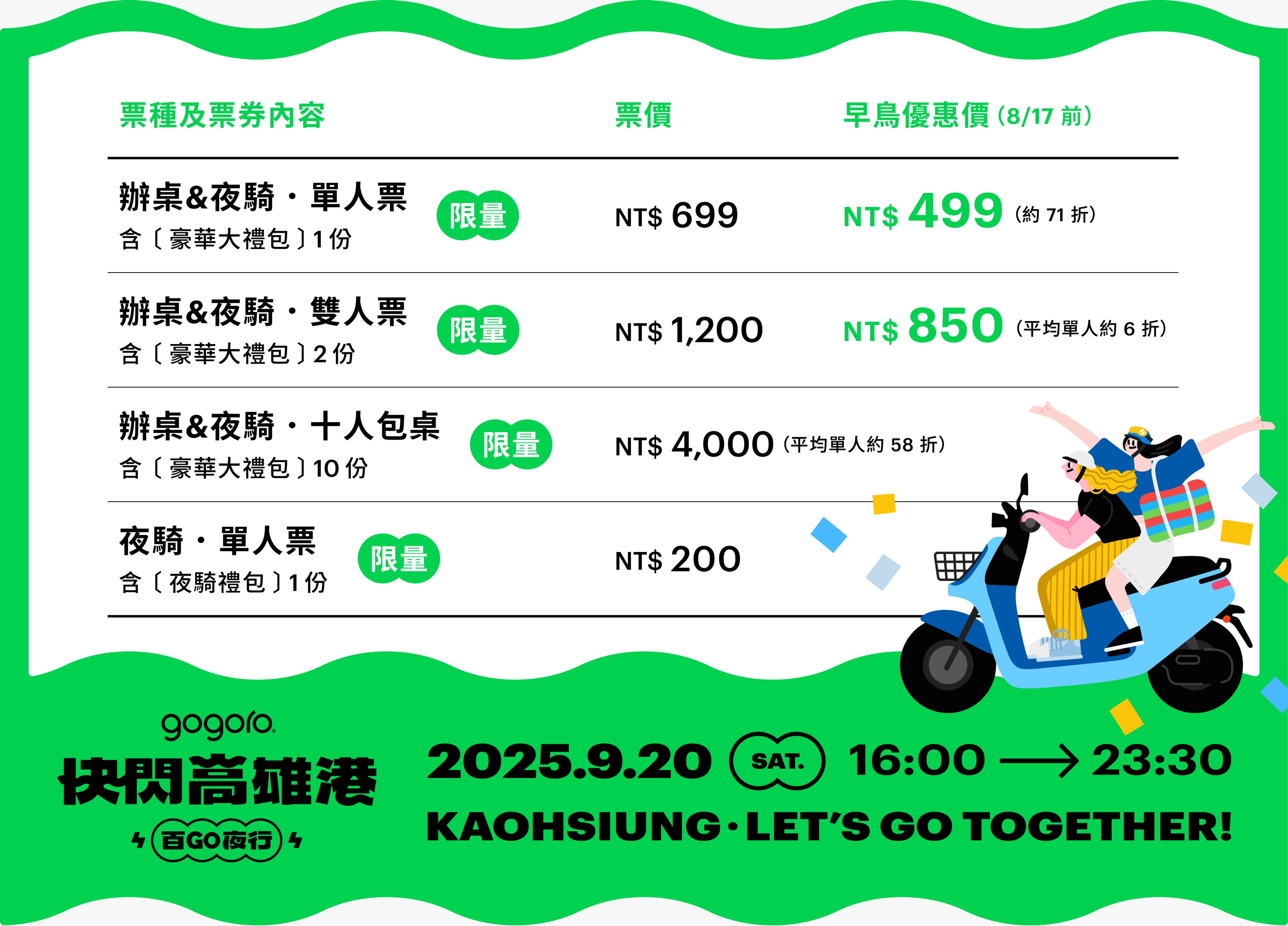 3. 快閃高雄港夜騎:需成功購票報名「夜騎票」或「辦桌&夜騎票」的電動機車車主,包含 Gogoro 及 PBGN 車主、GoShare 騎士(當天需自備車輛,名額有限,售完為止)
