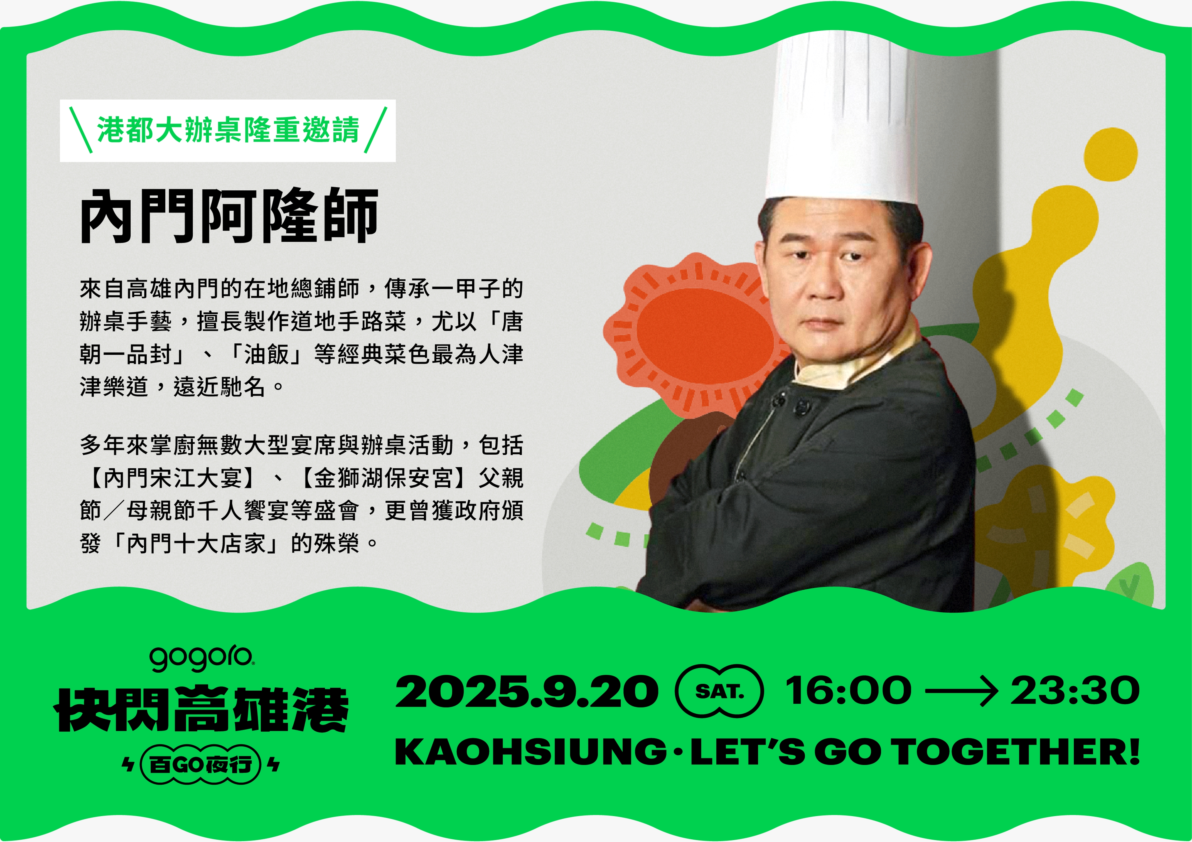 5. 本活動將於 2025 年 9 月 20 日舉行,除活動主辦單位邀請之參與者或參加高雄大市集活動以外,港都大辦桌活動及快閃高雄港夜騎活動之所有參與者均須於本活動網站完成購票報名程序,且經 Gogoro 確認出席本活動,方能視為活動之參與者(須非法人或相關團體,下稱「參加人」)。