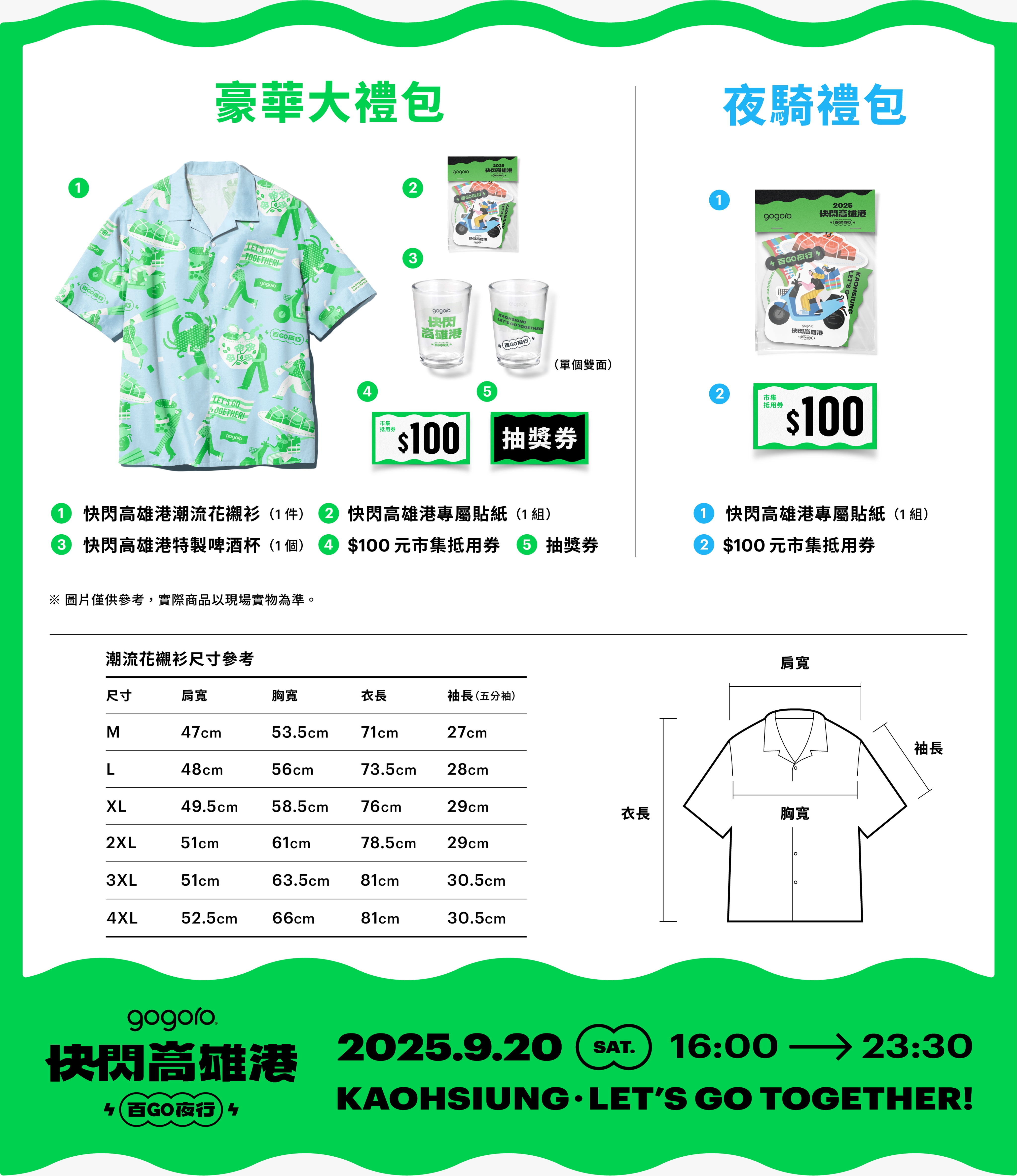 10. 「港都大辦桌」及「快閃高雄港夜騎」活動參加者完成現場報到將獲得獨家報到禮包--即豪華大禮包(辦桌&夜騎票)或夜騎禮包(夜騎票),若因有特殊事由無法完成活動報到者,請於 2025 年 9月 22 日~ 2025 年 10 月 20 日期間內主動聯絡承辦單位客服專線: (02) 2502-1929 #70(服務時間:週一至週五 12:00 - 18:00),承辦單位將酌收運費協助寄送禮包,惟若未主動聯絡上述客服專線,視同放棄權利,Gogoro 與承辦單位恕不主動提供寄送服務。禮包均以實物為準,參加人不得挑選,亦不得要求 Gogoro 將贈品折現、替換為其他物品,或將受贈資格移轉予他人;參加人亦不得轉售贈品。惟 Gogoro 得變更贈品之品項及內容,參加人同意無條件接受 Gogoro 所替換之物品。