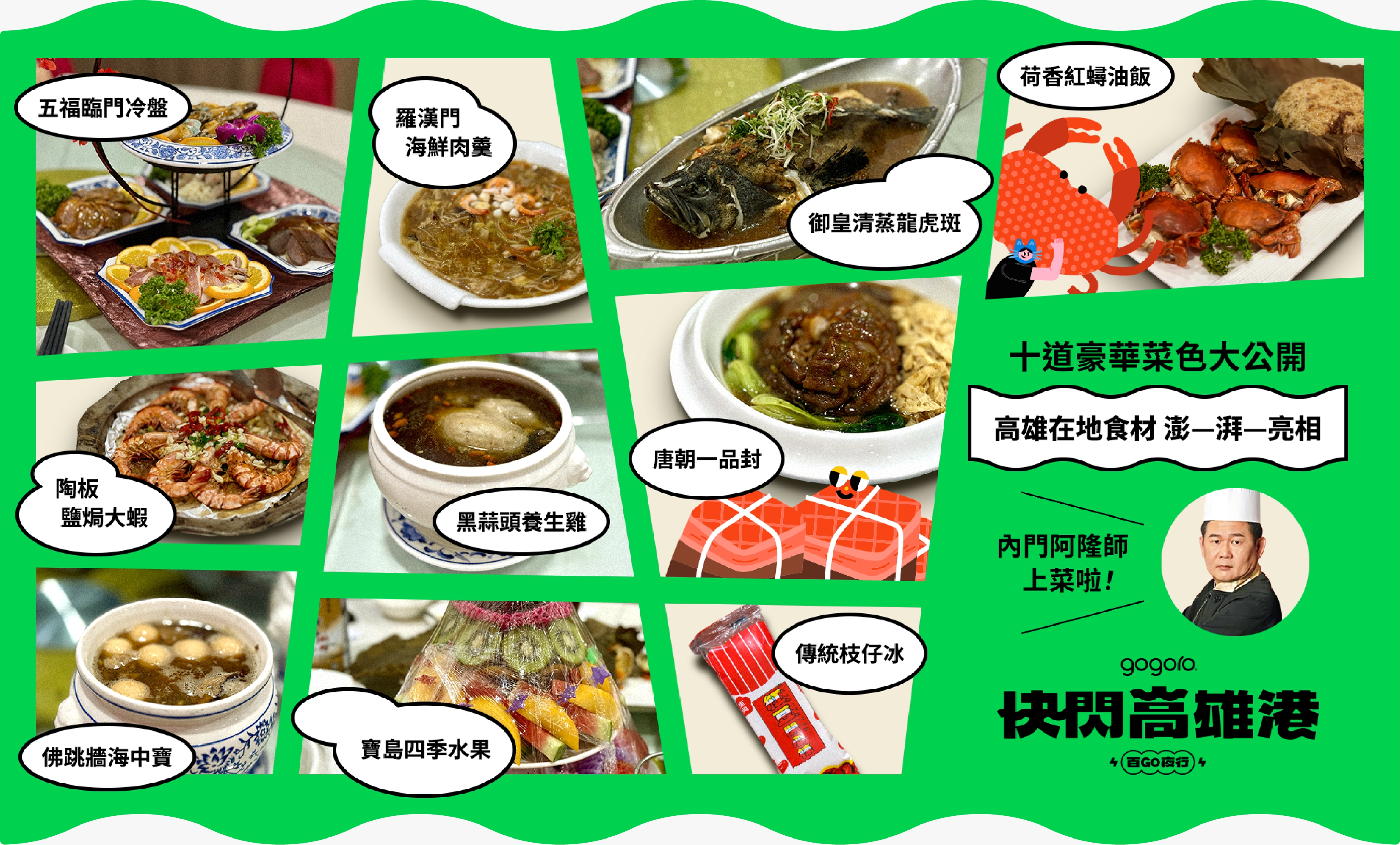 海港第一排設宴,運用高雄在地食材,由老牌總鋪師「內門阿隆師」掌杓,獻上十道最經典的辦桌名菜,保證讓你大呼值得!辦桌席次有限,手刀購票報名,提前卡位!